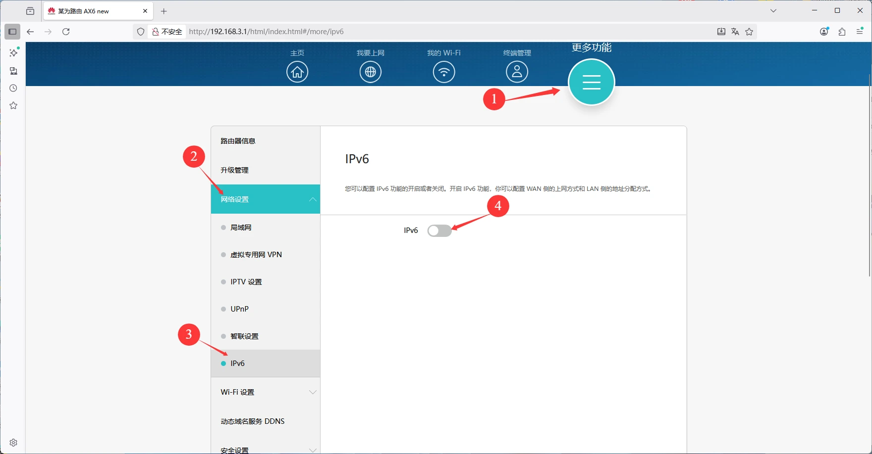 下面是我关闭IPv6的步骤我的路由器是某为的AX6 new大家可以参考一下,因为品牌与型号的不同不能保证大家的操作方式都一样,仅供参考。