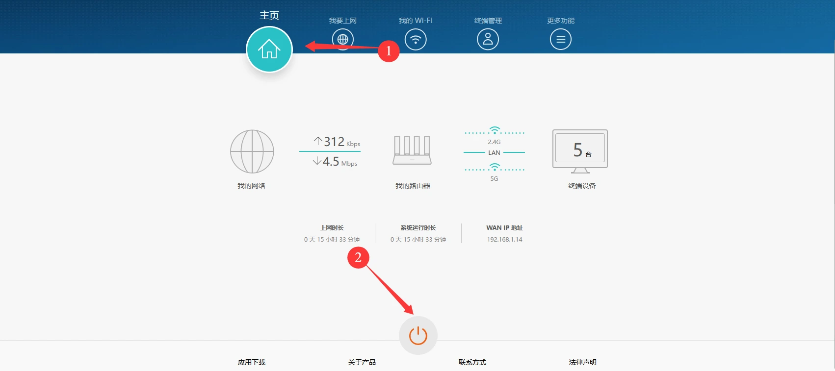 网页端重启路由器:单击主页 -> 下方的电源按钮 确定重启即可。